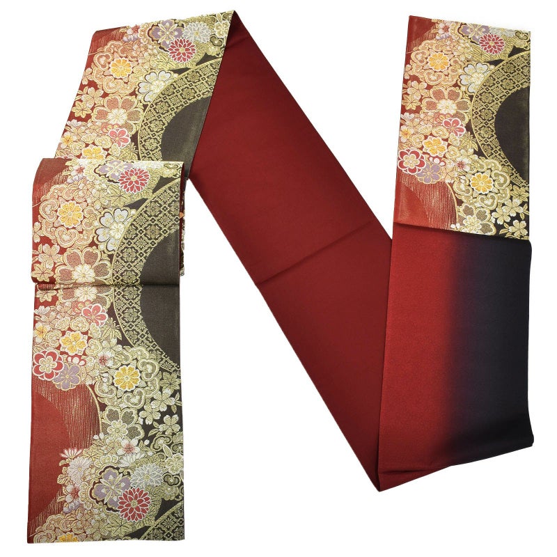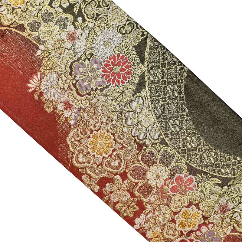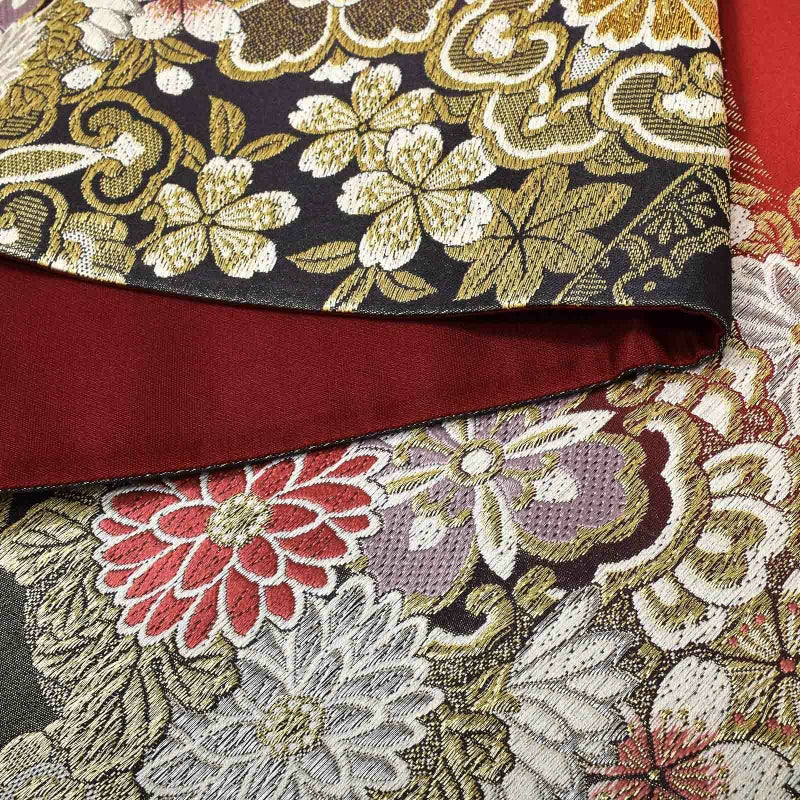 【色柄】金糸が細かに織り込まれた黒×深い赤の地に、金で豪奢に織られた花紋が流れるように配された袋帯です。晴れの日を彩る振袖に。お手持ちの振袖に合わせて、また、ママ振や姉振に合わせて、自分だけの装いに。成人式、結婚式などのおめでたい席の振袖に。上品な華やかさを演出してくれます。