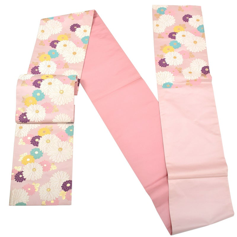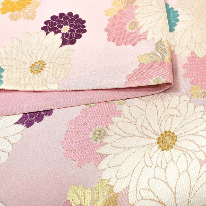 【色柄】薄ピンク地に金糸で縁取った白、黄金色、濃い紫、ピンクの万寿菊を配した可憐な印象の袋帯です。晴れの日を彩る振袖に。お手持ちの振袖に合わせて、また、ママ振や姉振に合わせて、自分だけの装いに。成人式、結婚式などのおめでたい席の振袖に。上品な華やかさを演出してくれます。
