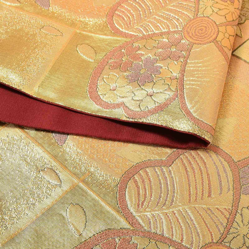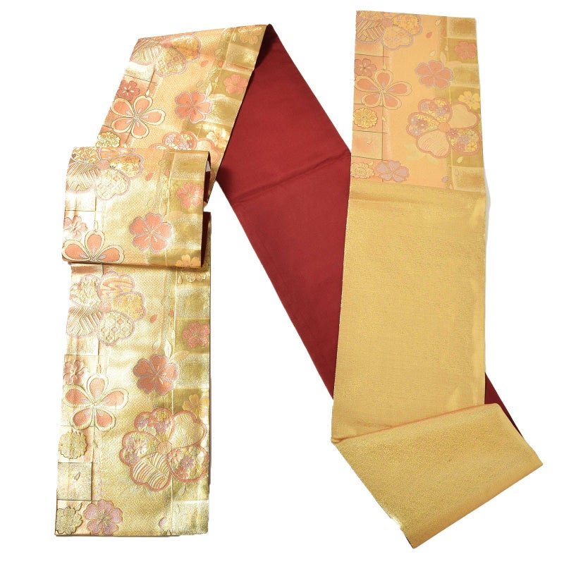 【色柄】金糸で市松文様に織られた帯地に大きな捻じり花、大小の花を配した煌びやかな振袖用袋帯です。