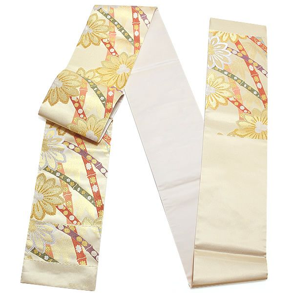 柔らかなゴールドの色合いで、お着物に合わせやすい帯です。また、柄が大きく、華麗にお着物を彩ります。