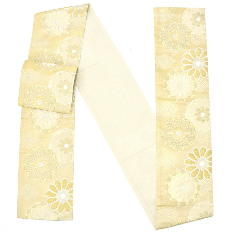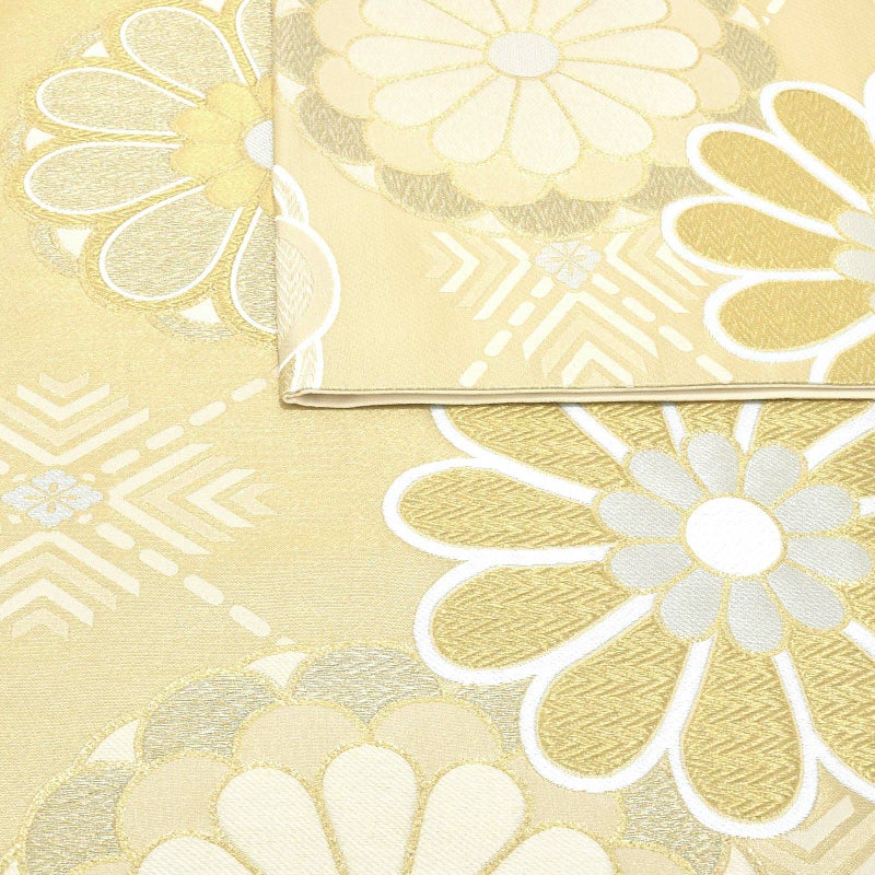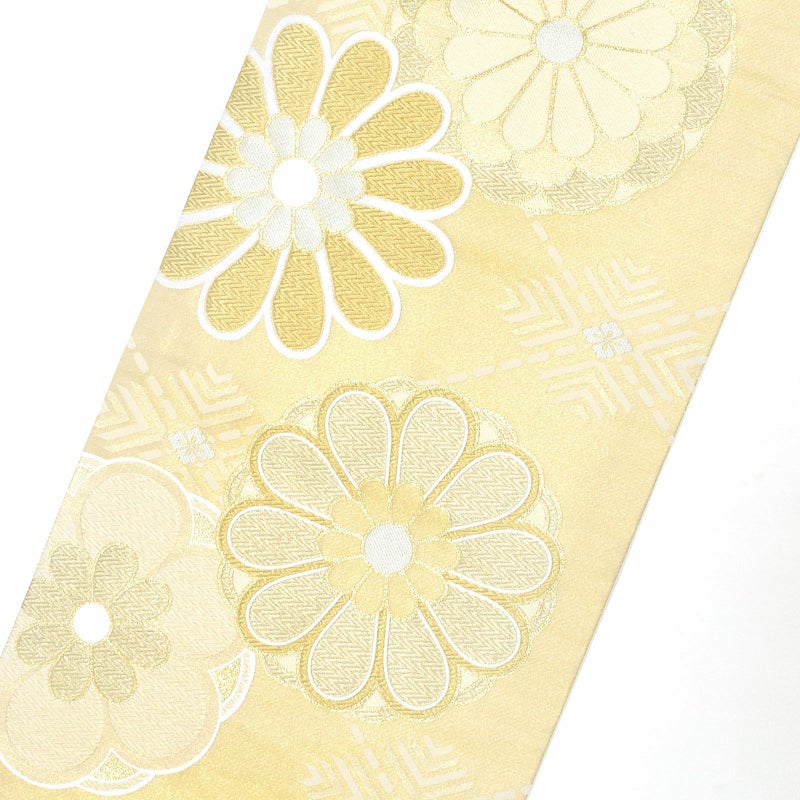 ゴールドを基調に白やシャンパンゴールドで花菱や大きな菊花が表現されています。古典的なかわいらしさと上品な煌びやかさのある帯です。