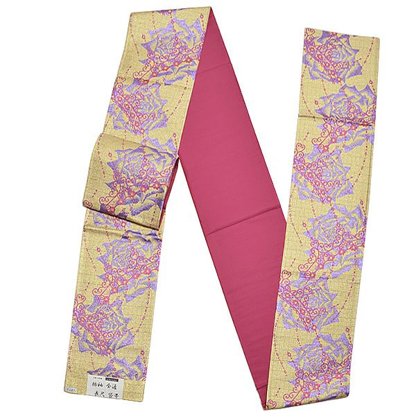 通常の袋帯より長めなので、変わり結びをしたい方にもおすすめですし、ふくよかな方でも安心して締めていただけます。(ウエスト約100cmくらいまで対応)