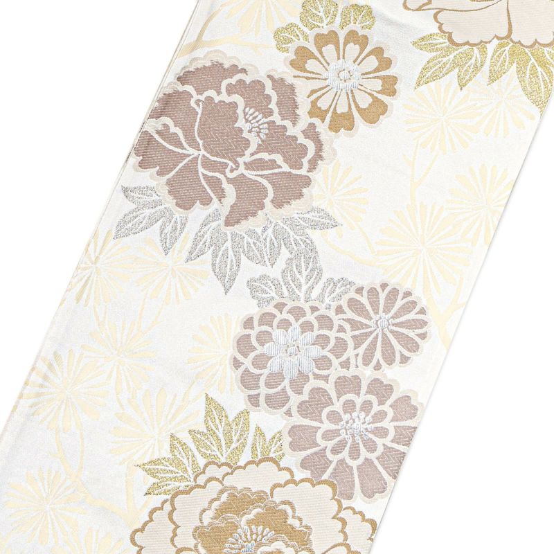 4. 振袖 袋帯 単品「鳥の子色地、金×白茶 牡丹に菊」日本製 お仕立て上がり 振袖用 袋帯 お仕立て済 振袖帯 結婚式 成人式 フォーマル【メール便不可】
