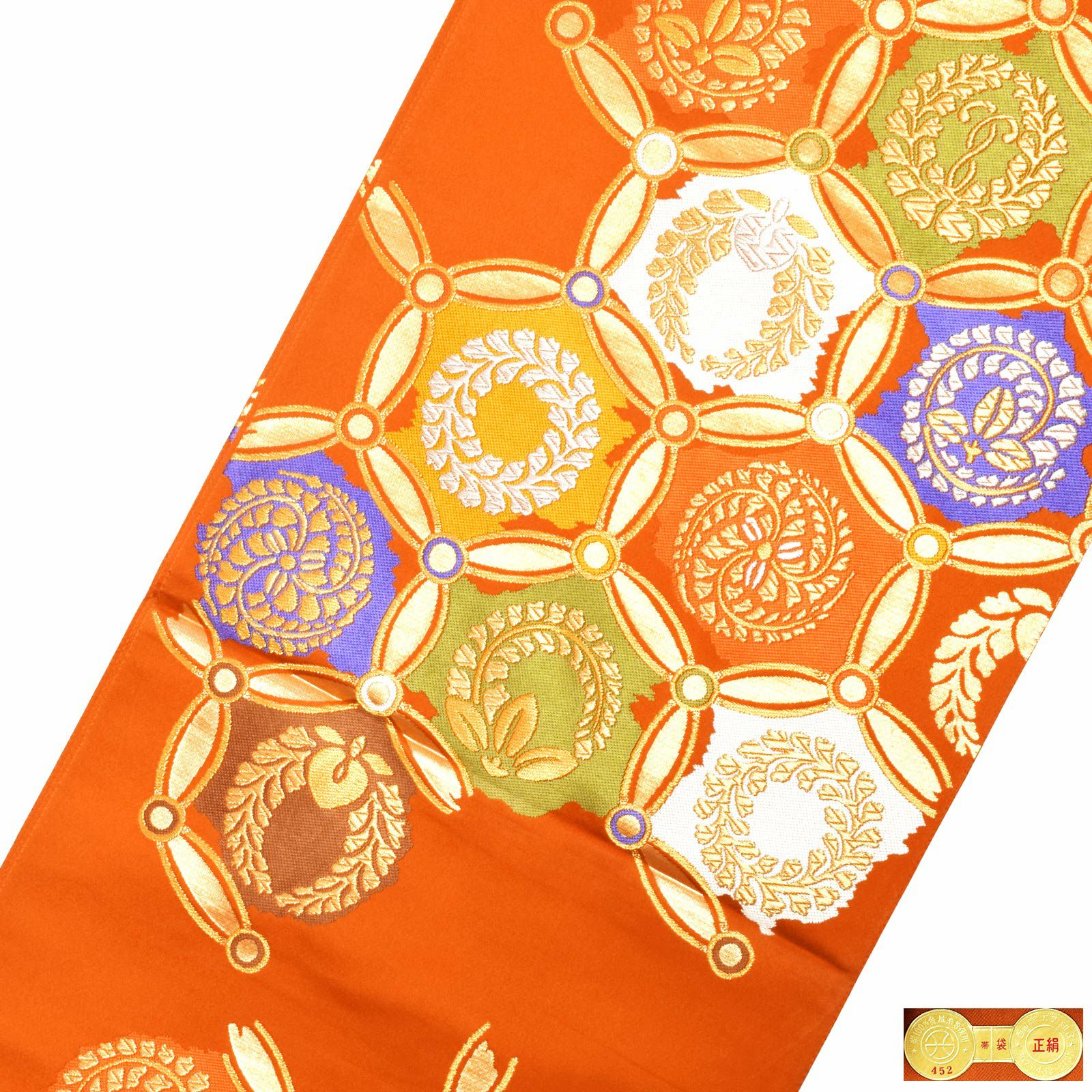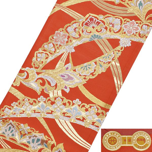 他の画像を見る 送料無料 店頭あり 振袖向けの華やかな袋帯 【Prices down4】振袖 帯 振袖用袋帯 「朱色地 輪繋ぎに藤紋」となみ織物謹製 西陣証紙番号No.452 六通柄 オレンジ 橙 日本製 西陣織 絹 未仕立て 振袖用 礼装用袋帯 新品 未使用 【メール便不可】<T>ss2512ofk40 きもの町価格 ¥ 59,400 税込 カートに入れる お気に入りに登録する