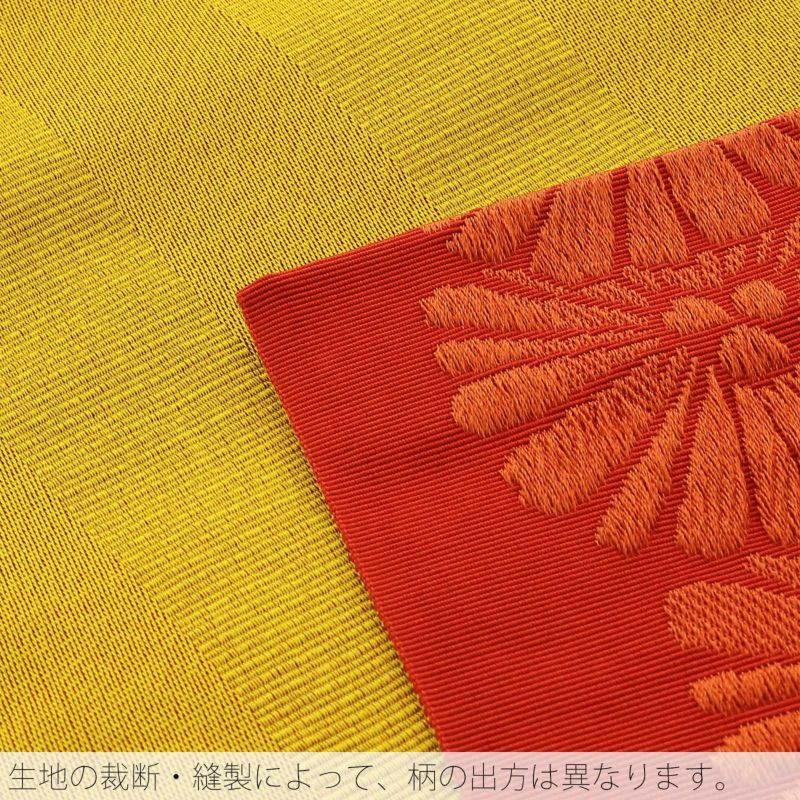 【カラー】明るい黄系の赤に、深いオレンジ色の花模様が並んだ帯。菊花のような唐松文様のような、シンプルながらどこか古典的な雰囲気のあるデザイン。裏は金茶色の地に織の二筋の縞。