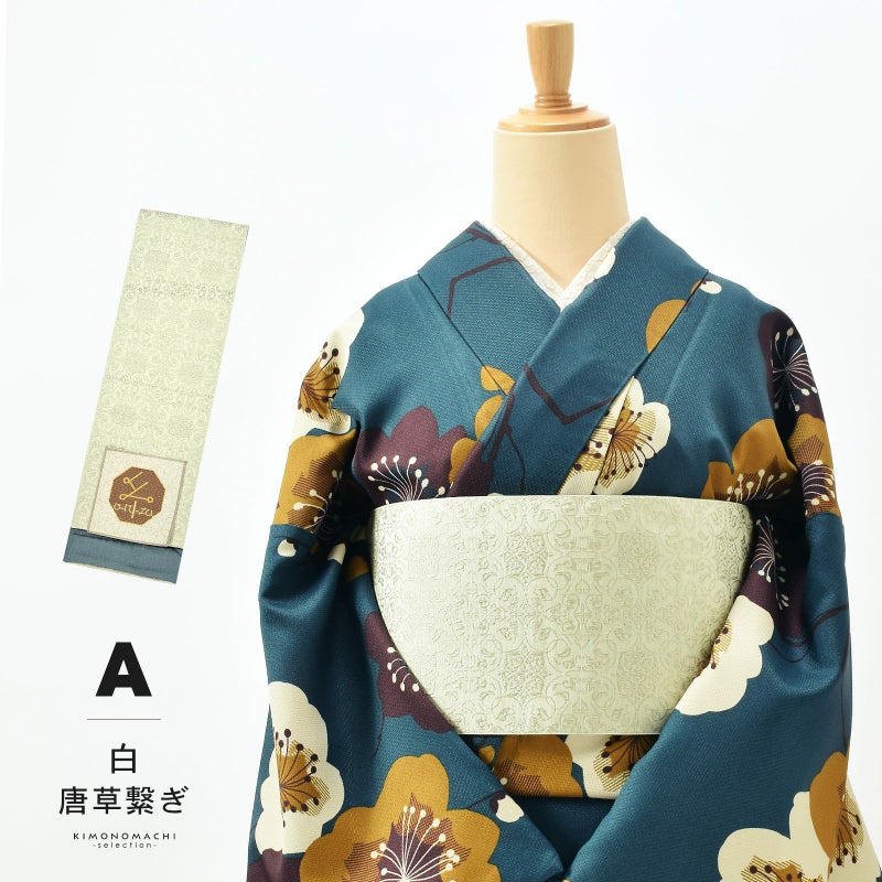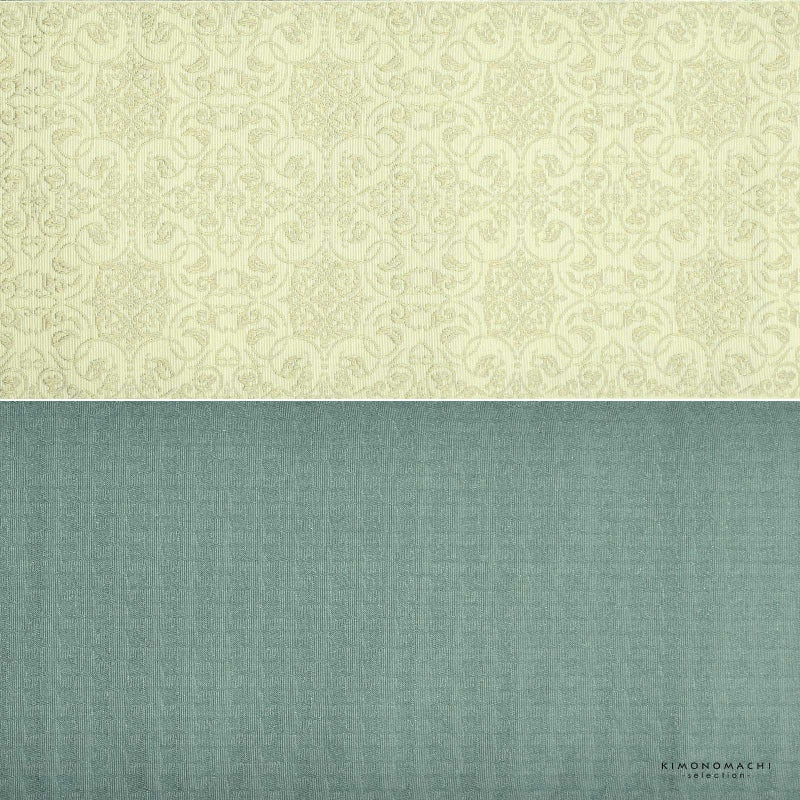 A.白 唐草繋ぎ:アイボリーの地に淡いベージュと淡いグレーの混色で織り出された四つ花の唐草文様。裏は灰青の千鳥格子風。