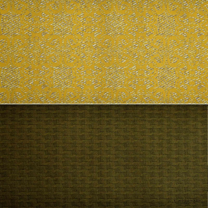 B.からし色 唐草繋ぎ:深いからし色の地に淡いグレーと濃いグレーの混色で織り出された四つ花の唐草文様。裏は浅い黒の千鳥格子風。