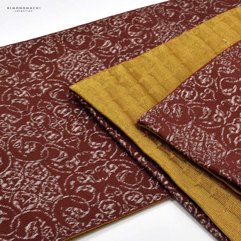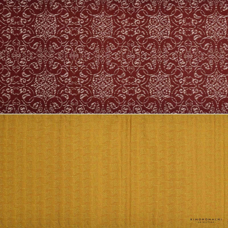 C.深紅色 唐草繋ぎ:深い赤地に淡いベージュと淡い茶の混色で織り出された四つ花の唐草文様。裏は金茶色の千鳥格子風。