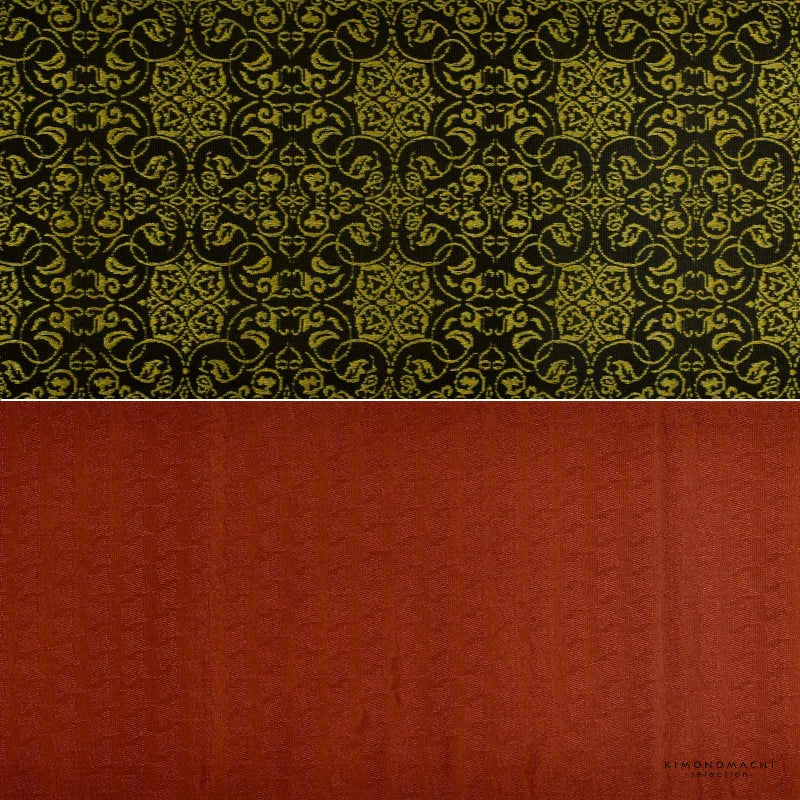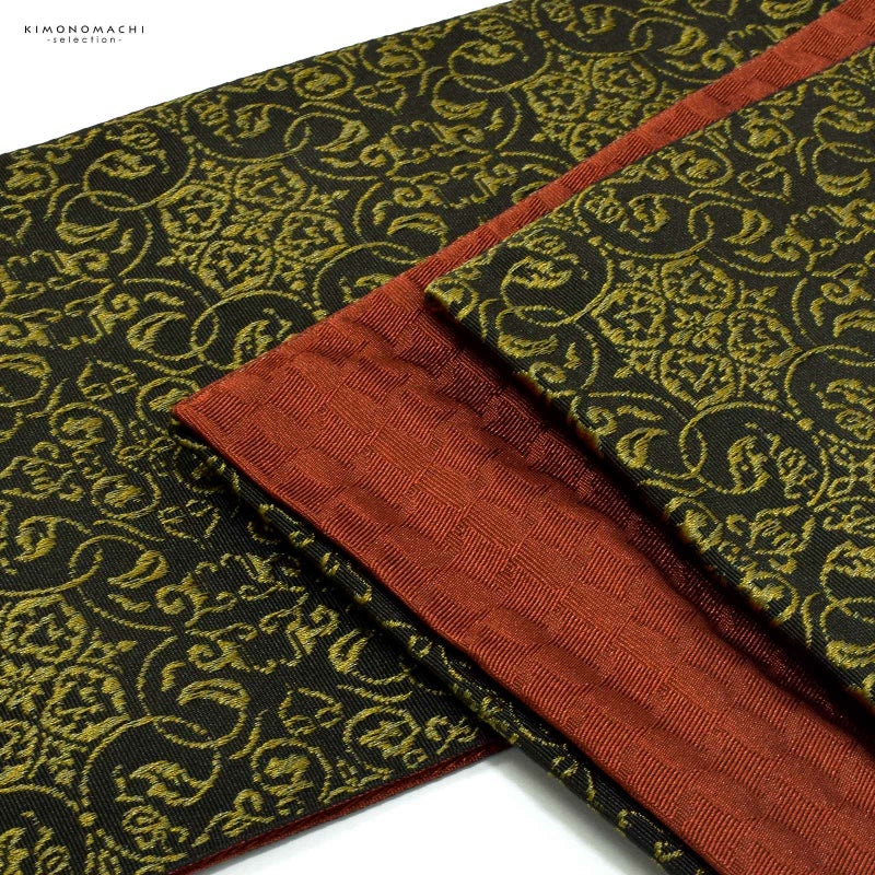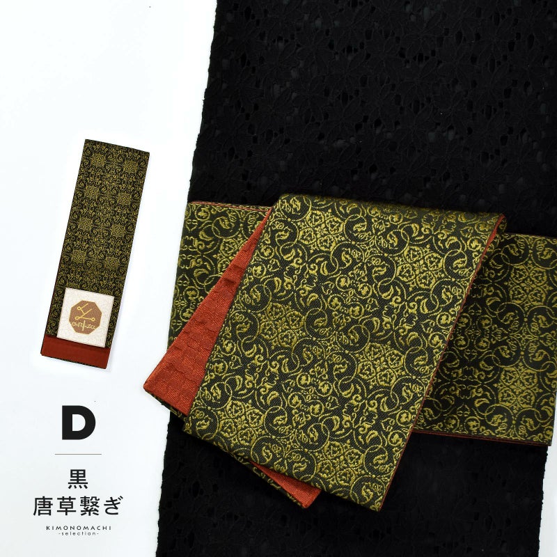 D.黒 唐草繋ぎ:黒地に浅いイエローゴールドで織り出された四つ花の唐草文様。裏は深い朱色の千鳥格子風。