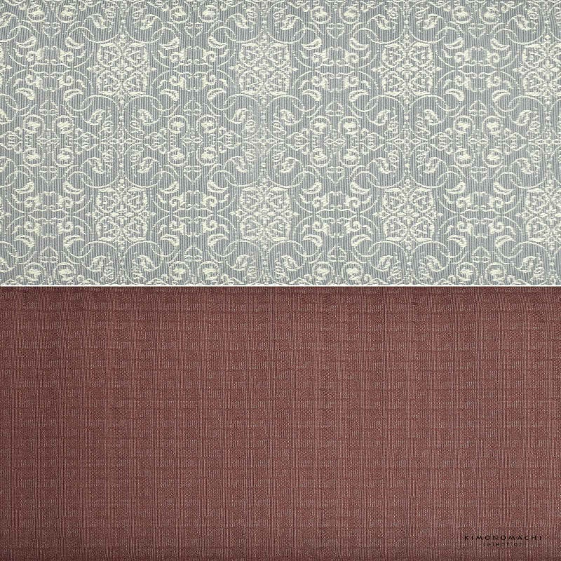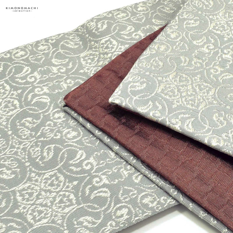 E.銀灰色 唐草繋ぎ:グレーの地に淡いシルバーグレーで織り出された四つ花の唐草文様。裏は小豆色の千鳥格子風。