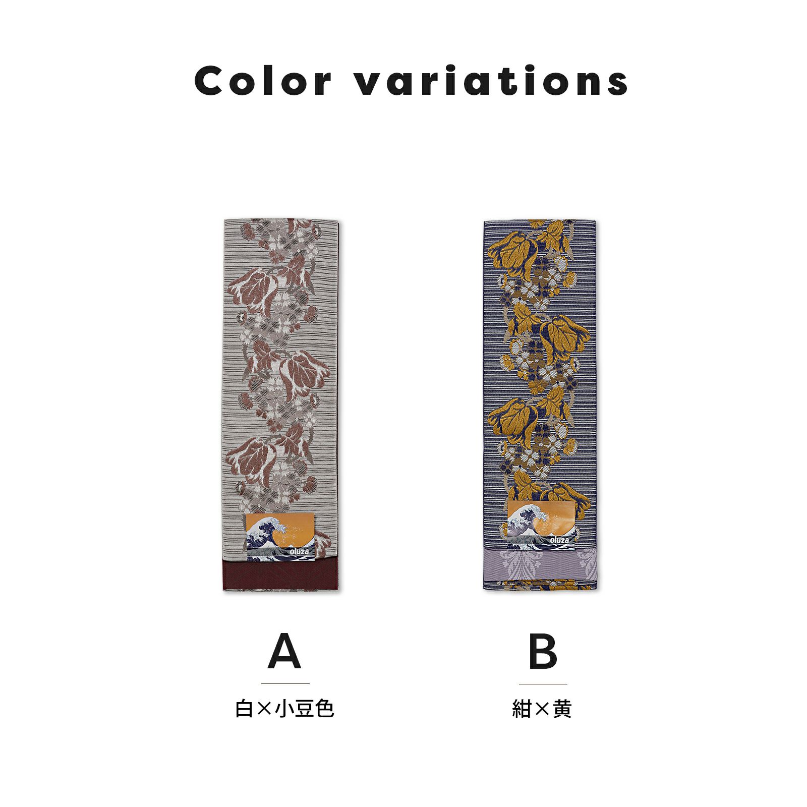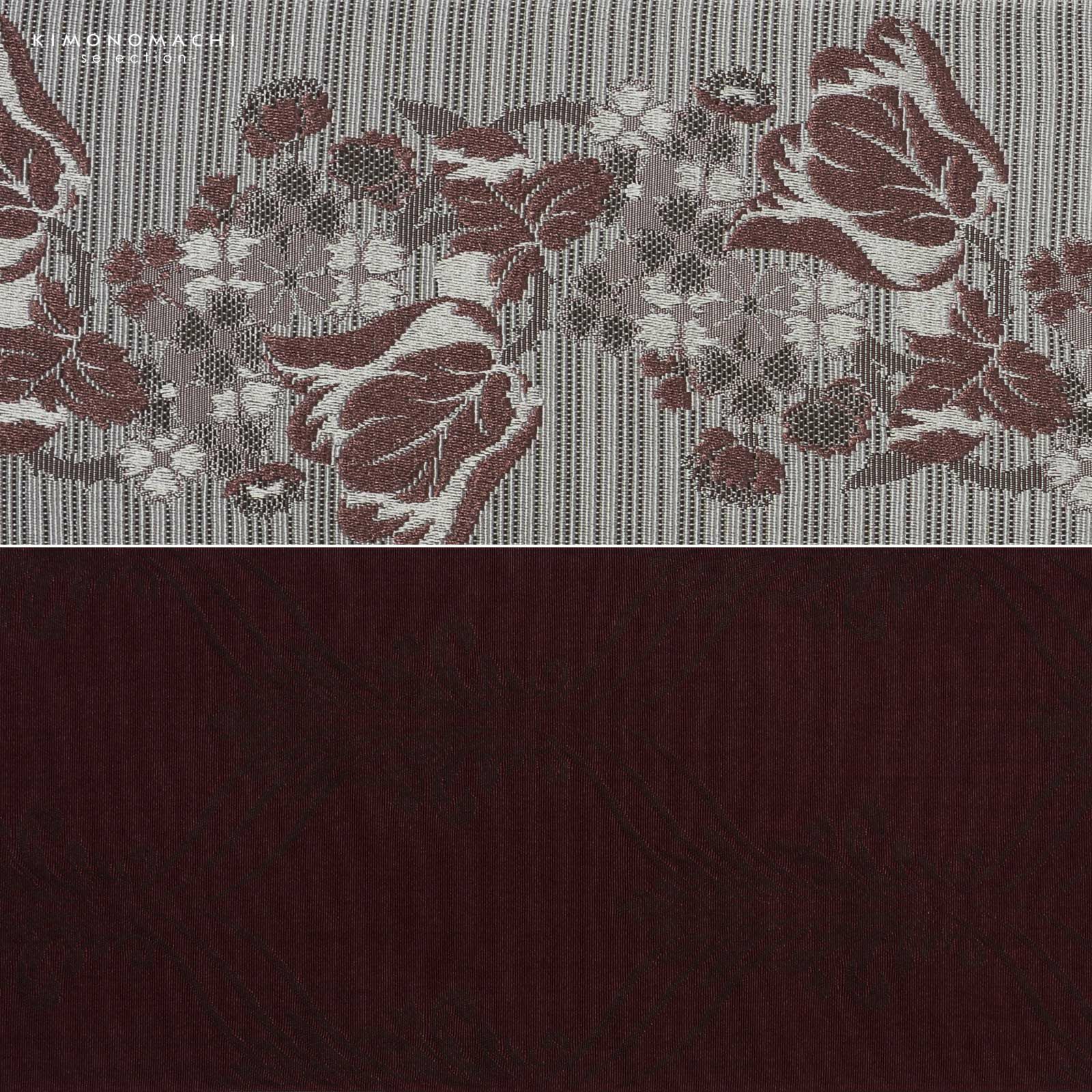 A.白×小豆色:グレイッシュな白に深いグレーの筋の入った地。白、グレー、小豆色でチューリップをメインとした花々が縦向きに織り出されています。裏は深い赤紫のヒヤシンス風のアラベスク文様。