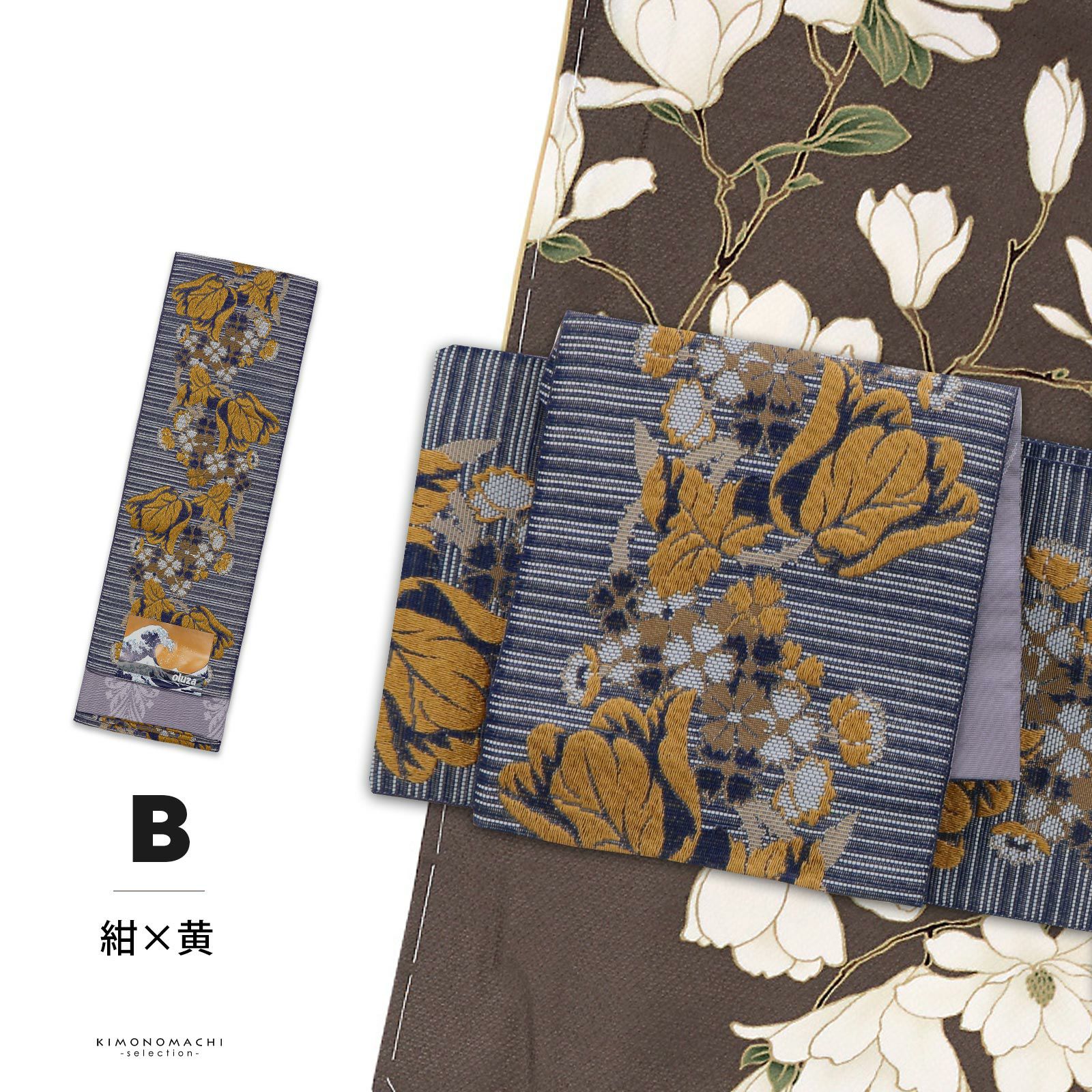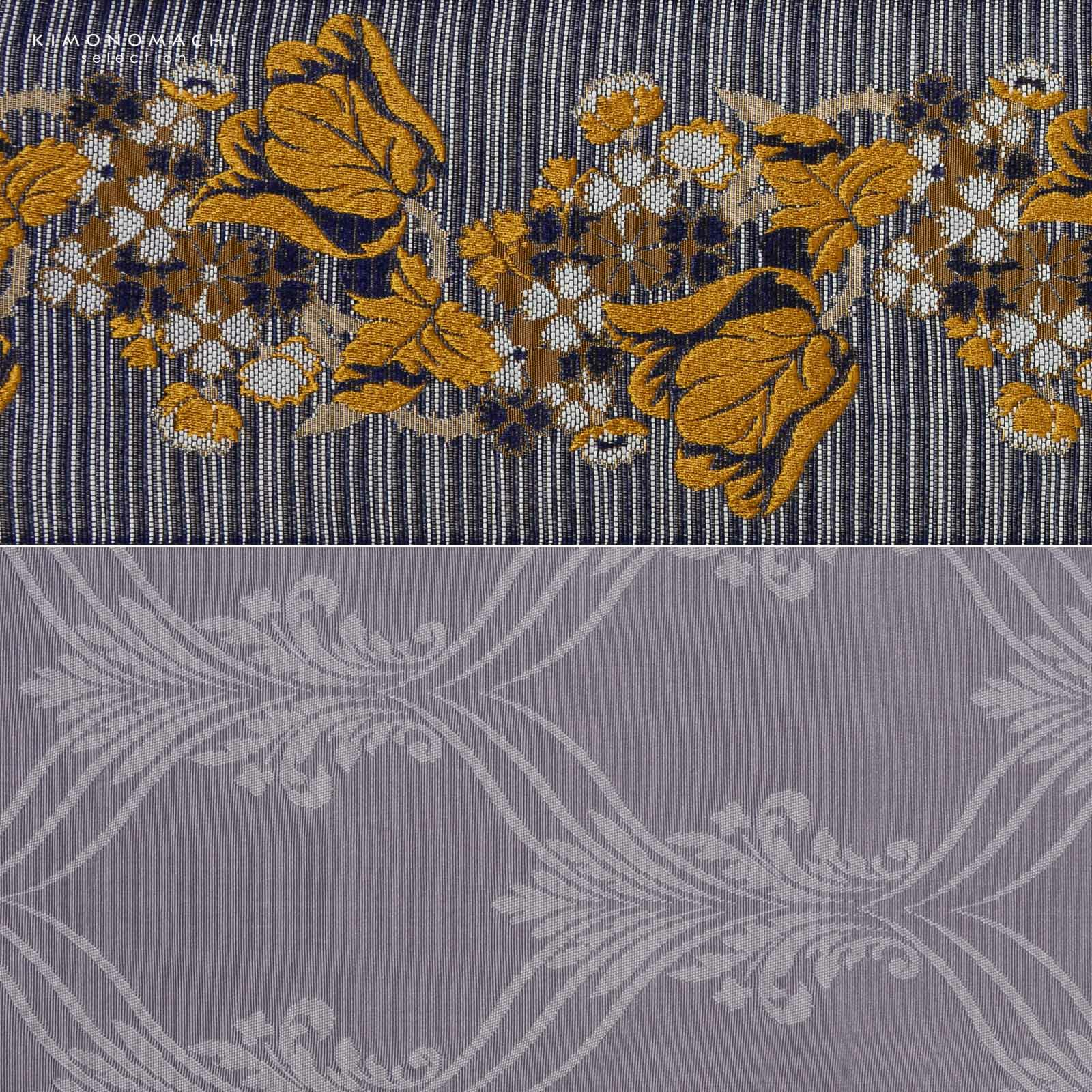 B.紺×黄:浅い紺にグレイッシュな白の筋の入った地。深い黄色、紺、白でチューリップをメインとした花々が縦向きに織り出されています。裏は浅い藤色のヒヤシンス風のアラベスク文様。