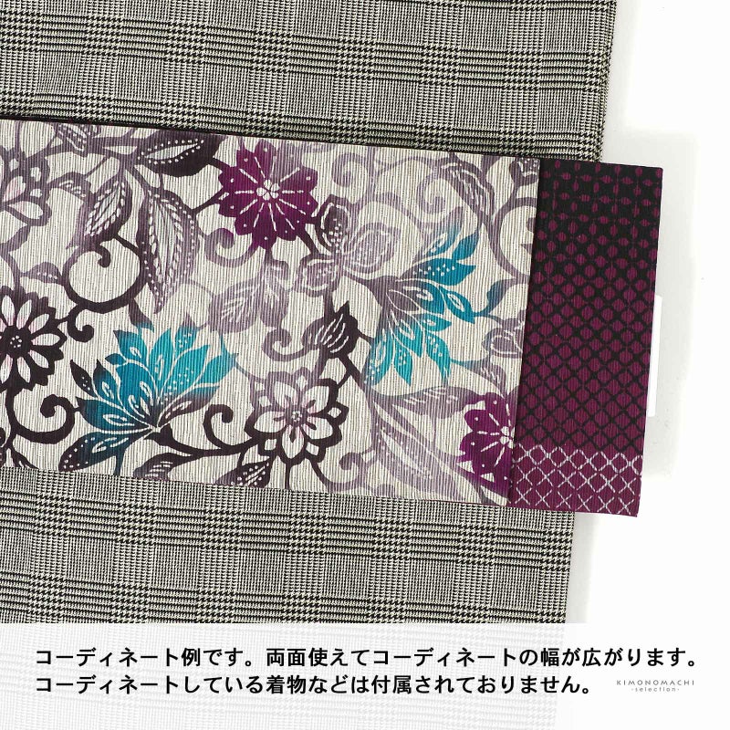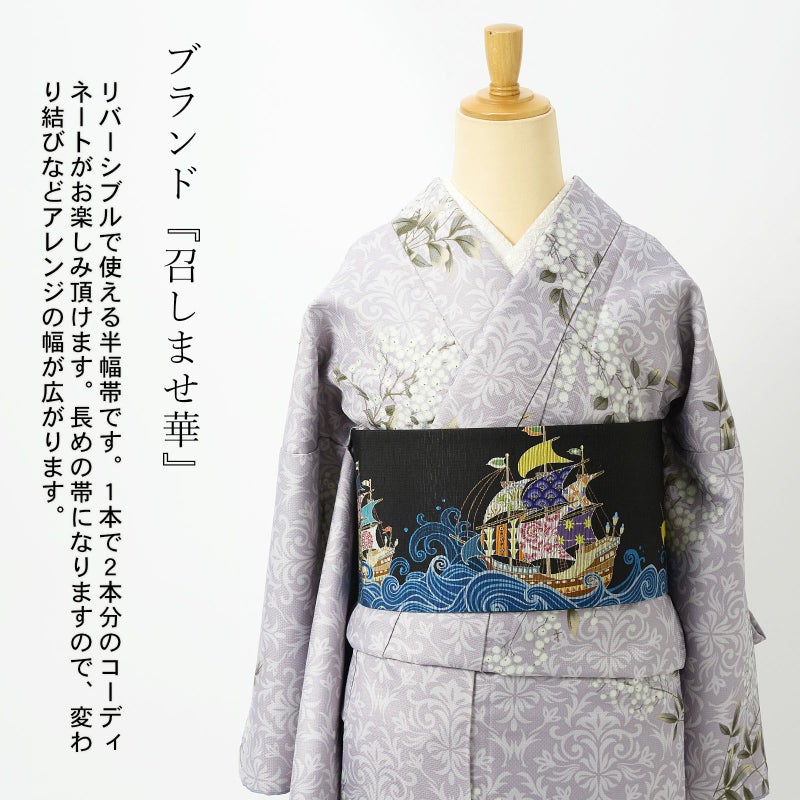 ブランド『召しませ花』のリバーシブルで使える半幅帯です。1本で2本分のコーディネートがお楽しみ頂けます。