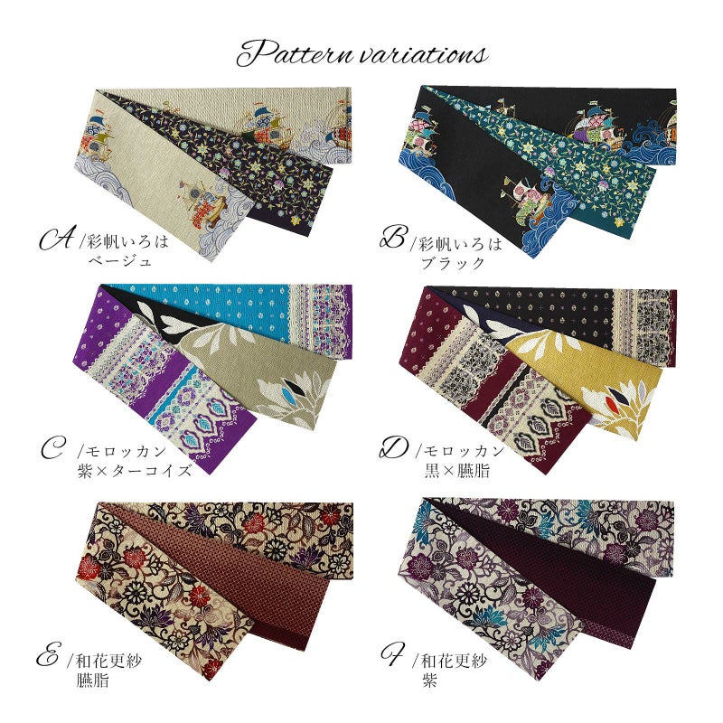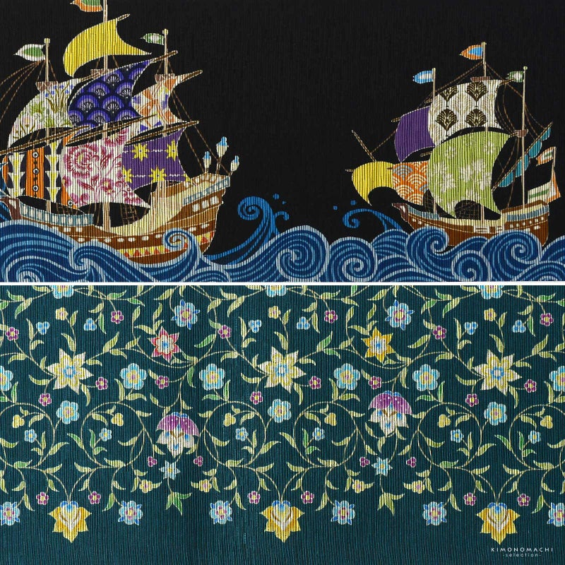 B.彩帆 いろは ブラック:黒地にあざやかな青の波。茶にベージュ、黄色、緑に紫、ロイヤルブルーなどカラフルな大小の帆船。裏面はやや鈍い深い青緑の地に黄緑、黄色、水色、紫などの小花の唐草文様。