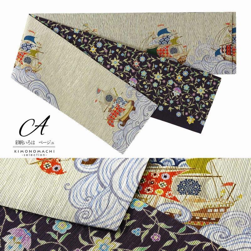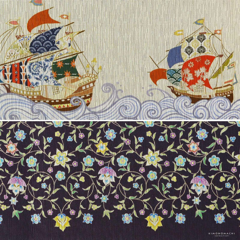 A.彩帆 いろは ベージュ:グレイッシュな緑みのベージュの地にブルーグレーの波。茶に赤、黒、紺、灰緑などカラフルな大小の帆船。裏面は鈍い紫みの濃いグレーの地に黄緑、黄色、水色、パープルなどの小花の唐草文様。
