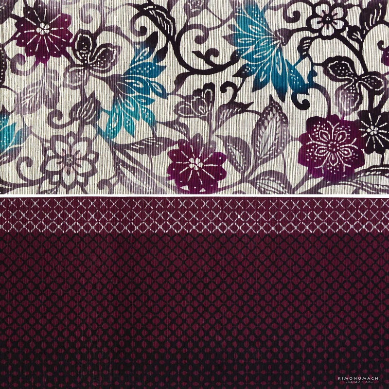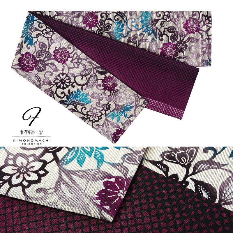 F.和花更紗 紫:グレイッシュな象牙色の地。黒と藤鼠色のぼかしを基調に紫、ターコイズブルー、淡いピンクの挿し色が入った型染め調の唐草に花文様。裏面は葡萄色に黒と白の細かな格子。