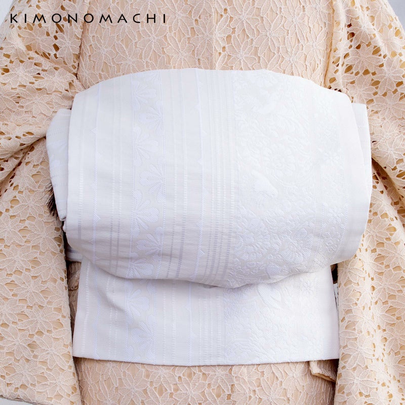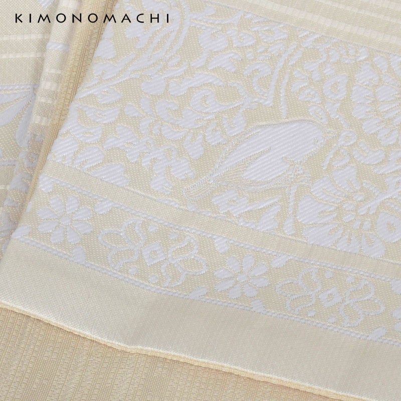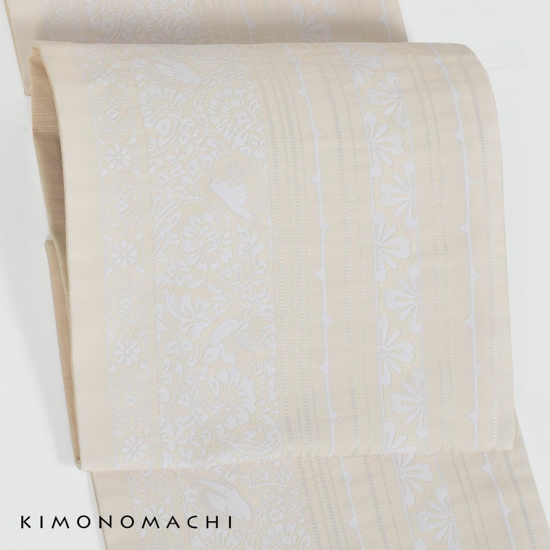 【色柄】アイボリーの地に、白の献上柄風の文様。縦縞に配置された柄は、約半分は花唐草の中を小鳥が飛び交う更紗柄、もう半分は交互に花角紋をのぞかせた縞や三角繋ぎ、合間に織りで表現された子持ち縞などシンプルなデザイン。裏地はエクルベージュ。合わせやすく、古典的な華麗さとすっきりとモダンな印象のある帯です。