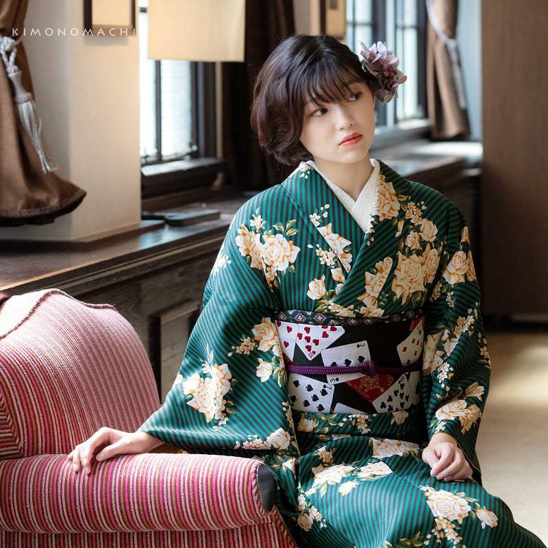 KIMONOMACHI オリジナル!京袋帯 袋名古屋帯 個性派 レトロモダン 京袋帯 単品 数量限定 KIMONOMACHI オリジナル 「黒 トランプ」 ポリエステル 名古屋帯 普段着着物用 京都きもの町オリジナル 日本製 【メール便不可】ss2509ong10