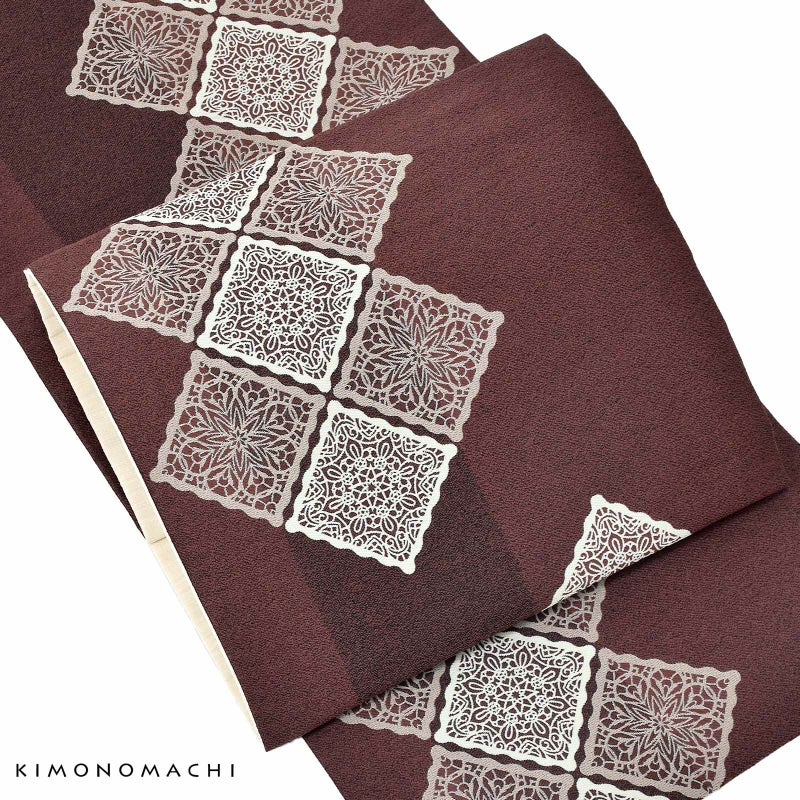【色柄】焦茶色に、黒鳶色の太い一本縞の通った地。アイボリー、グレージュのスクエア型のレースを繋げた模様。まるで本物のレース編みのような繊細で華やかなモチーフが織り出されています。裏地はアイボリー。