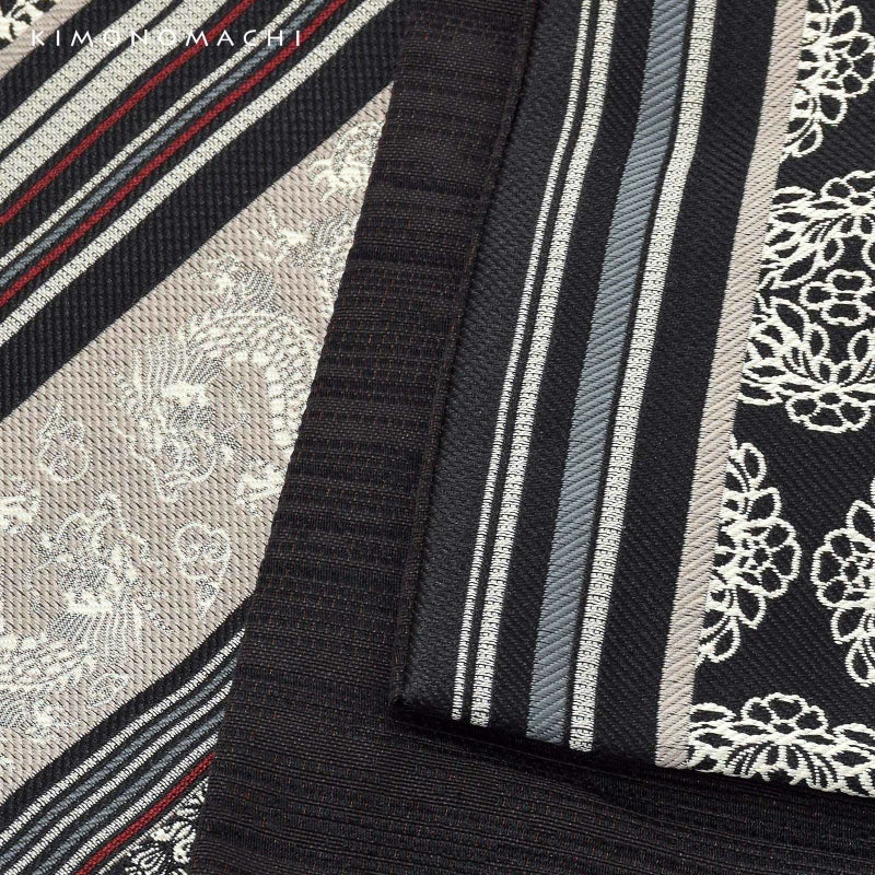 【色柄】黒地に縦縞に構成された柄。半分はグレージュにアイボリーの雲龍文様、もう半分は黒地にアイボリーの唐花文様を中心に、グレージュ、臙脂色、錆浅葱色の縞文様。中性的な雰囲気が格好良いデザインです。