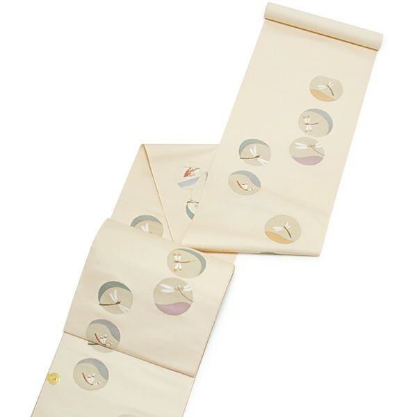 淡い柔らかな生成り色地に、青緑、灰青、茶色などの色使い。丸に蜻蛉模様。