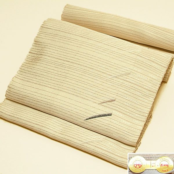 【Prices down2】西陣織名古屋帯 九寸帯「ごく淡い柔らかなベージュ ライン」創喜庵 (六通柄) 未仕立て 九寸名古屋帯 正絹帯 【メール便不可】<T>ss2512ong75