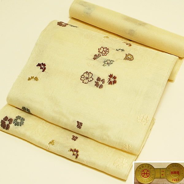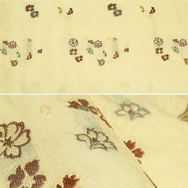 【Prices down2】西陣織名古屋帯 九寸帯「ごくごく淡いクリーム 花更紗」創喜庵 (六通柄) 未仕立て 九寸名古屋帯 正絹帯 【メール便不可】<T>ss2512ong75