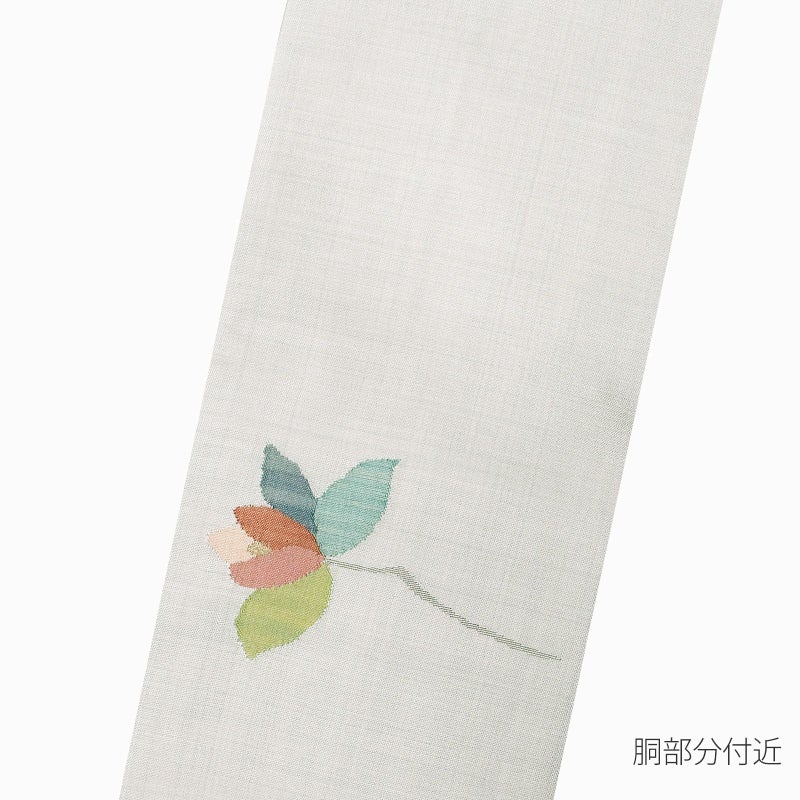 白と淡い灰色の格子の帯地。格子の色が入り混じって、全体的には灰みの白に見えます。ごく淡いコーラルピンク、浅い朱色の椿の花は、織の表現を変えて立体感を持たせています。緑や黄緑、浅い紺などで淡くかすれたように織り出した葉。全体的に淡く上品な雰囲気の色遣いです。椿の枝で囲った墨色の模様どりが引き締まった印象に。