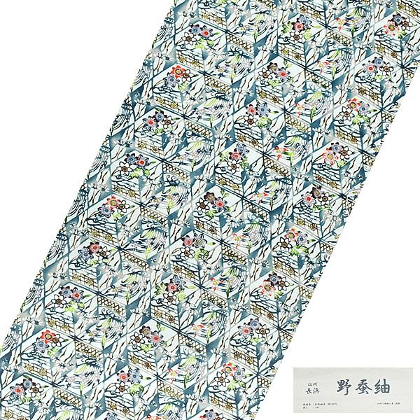 薄いブルー地に、暗い浅い青色、くすんだ緑、くすんだ赤色などの色使いの段に草花、菱模様。