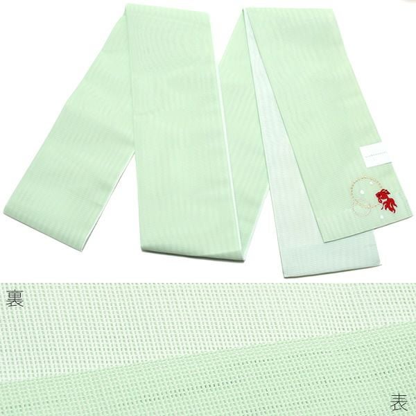 【Prices down2】夏半幅帯「グリーン 金魚」細帯 刺繍 お仕立て上がり 四寸帯 夏帯 【メール便不可】0ss2512oyk60