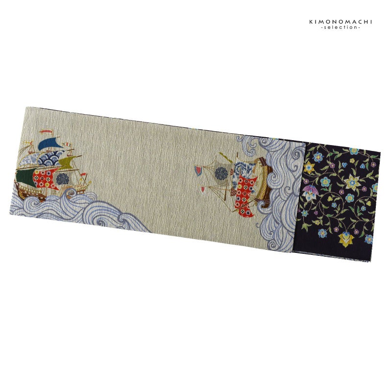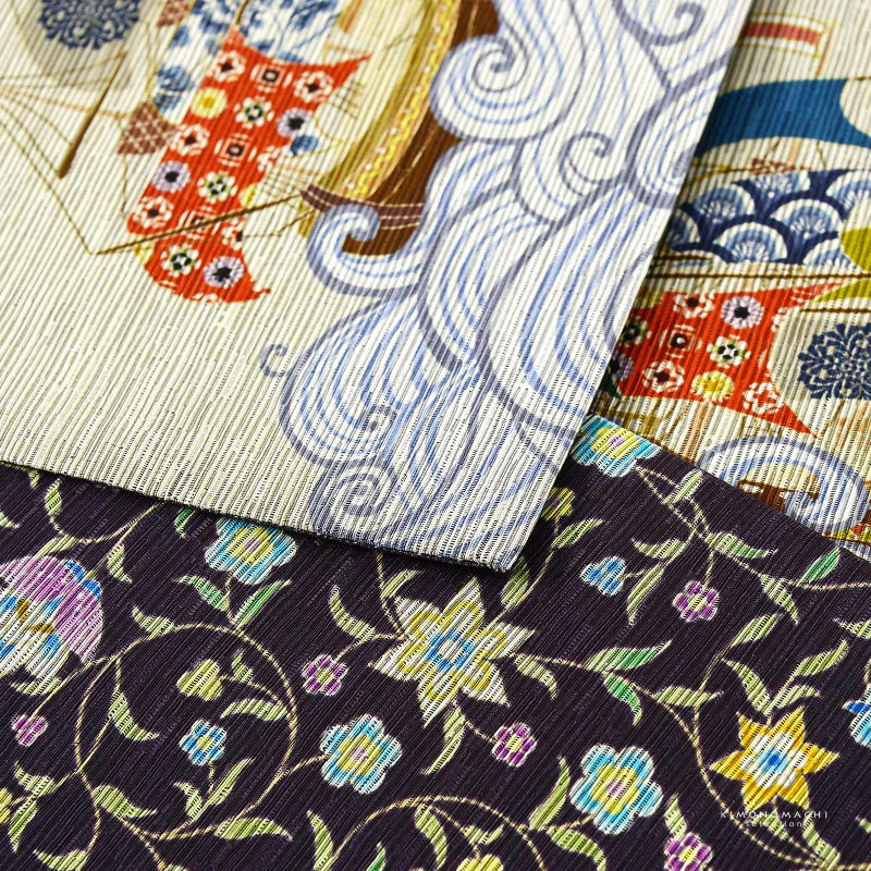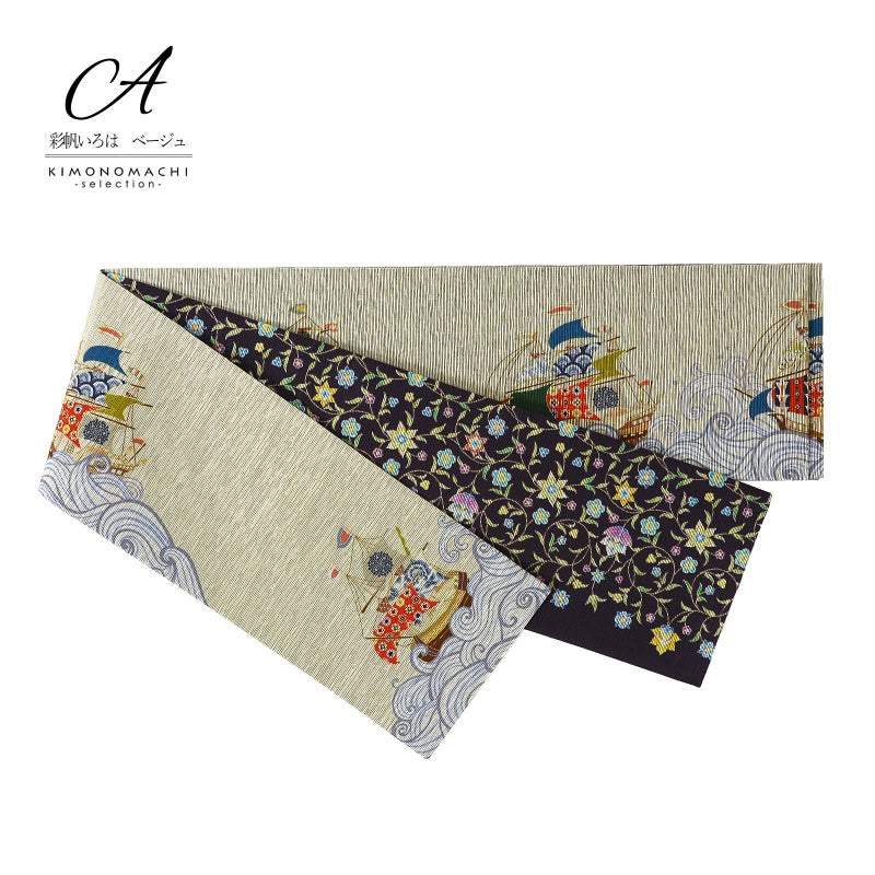 A.彩帆 いろは ベージュ:グレイッシュな緑みのベージュの地にブルーグレーの波。茶に赤、黒、紺、灰緑などカラフルな大小の帆船。裏面は鈍い紫みの濃いグレーの地に黄緑、黄色、水色、パープルなどの小花の唐草文様。