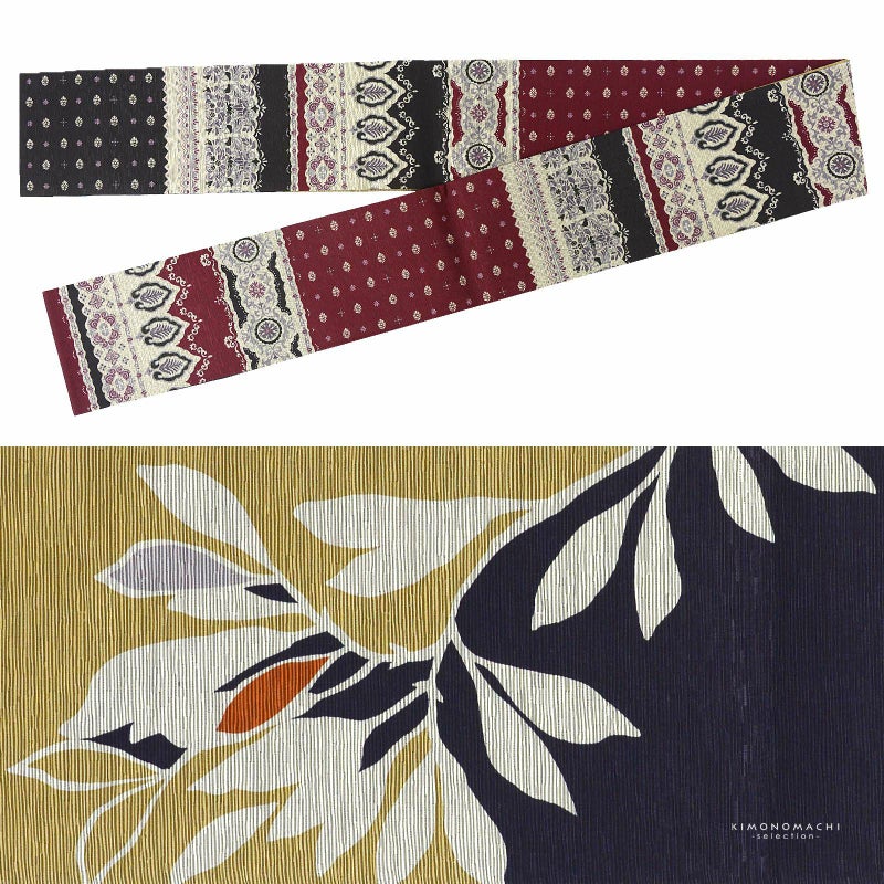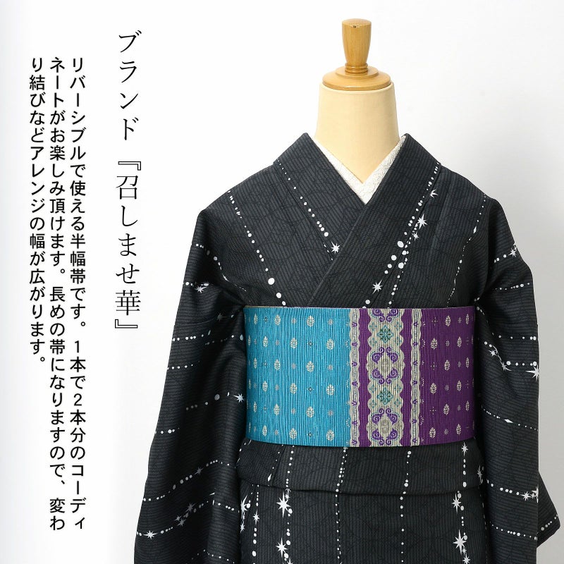 ブランド『召しませ花』のリバーシブルで使える半幅帯です。1本で2本分のコーディネートがお楽しみ頂けます。