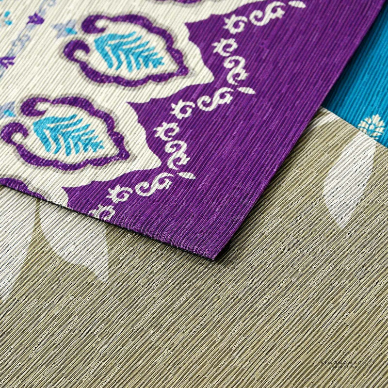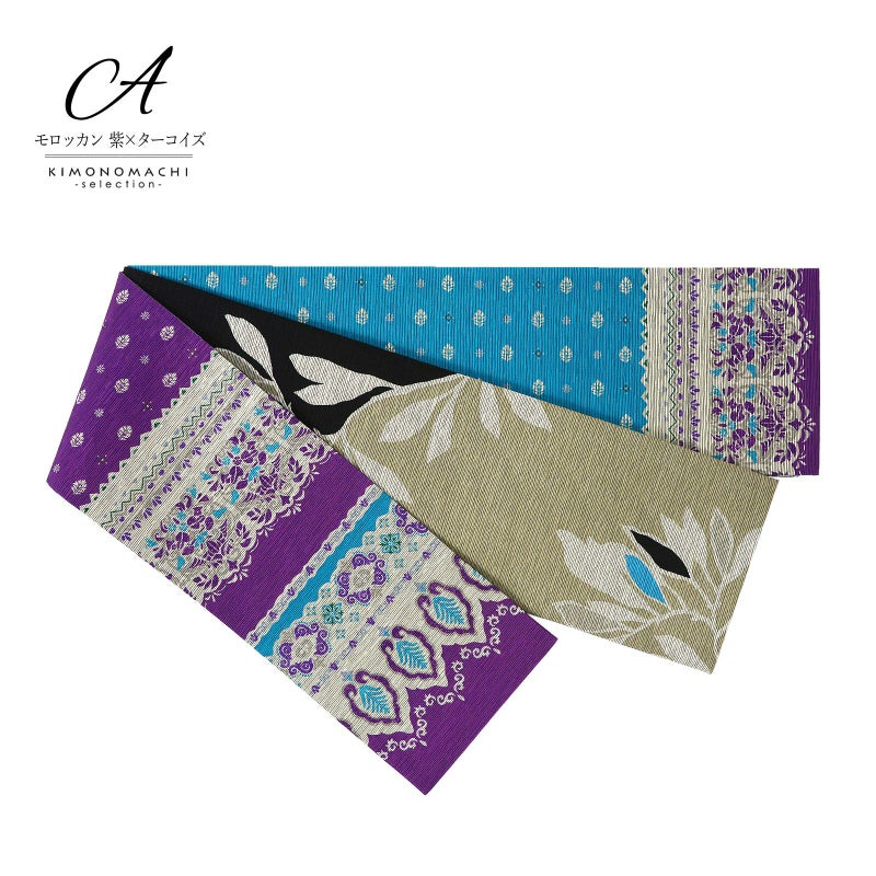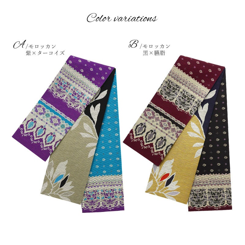 A.モロッカン 紫×ターコイズ:深い紫色とターコイズブルーを基調としたモロッカン風の小花や唐草の装飾が横段に表現されています。裏面は黒とグレージュのリーフ柄。