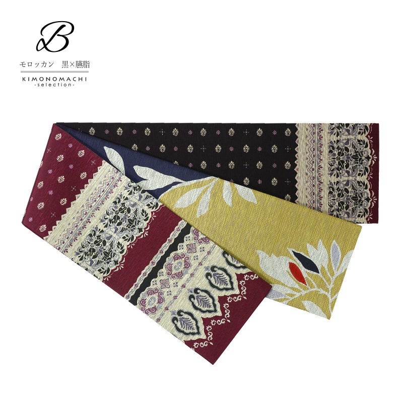 B.モロッカン 黒×臙脂:黒と臙脂色を基調としたモロッカン風の小花や唐草の装飾が横段に表現されています。裏面は黒と浅い黄土色のリーフ柄。