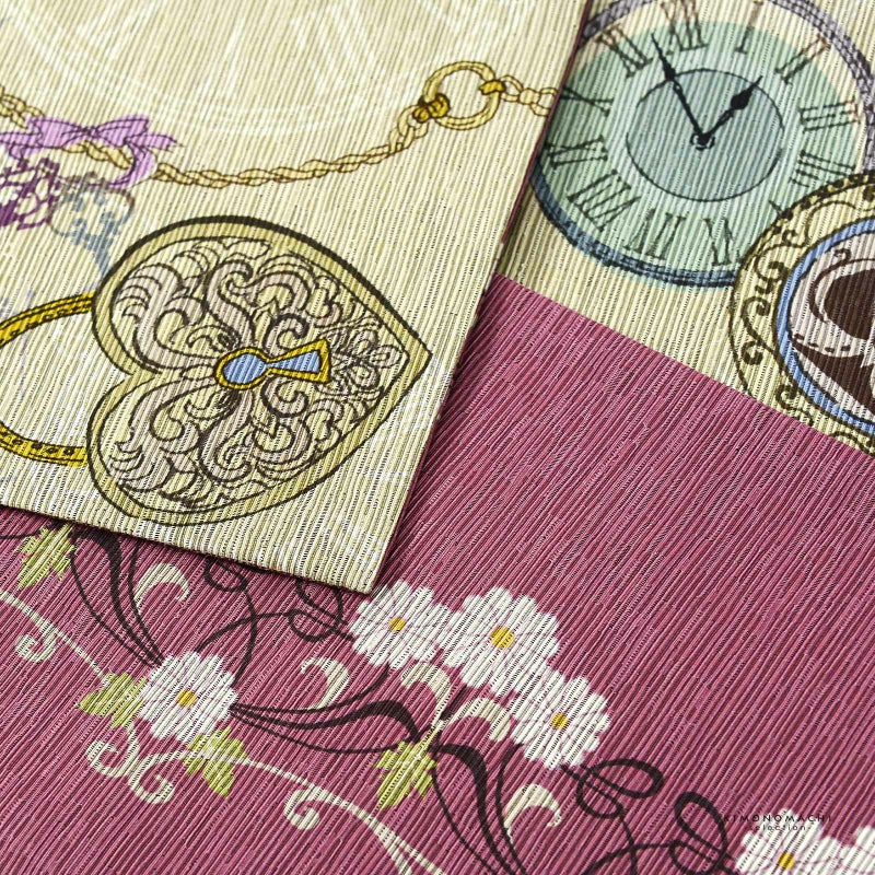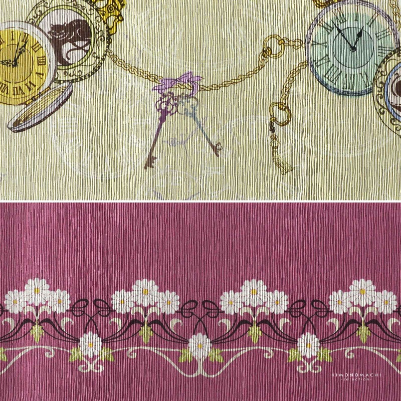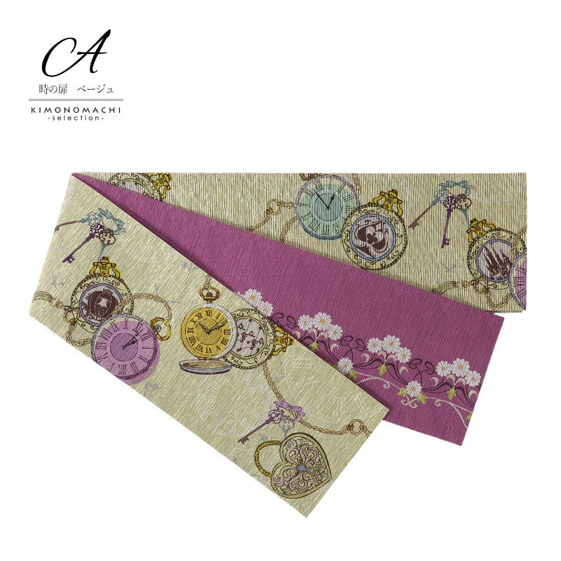 A.時の扉 ベージュ:グレイッシュな緑みのベージュの地にパープル、黄色、淡いブルーの配色で手描き調の懐中時計や鍵が表現されています。裏面は浅い赤紫色の地に白い小花の唐草文様。