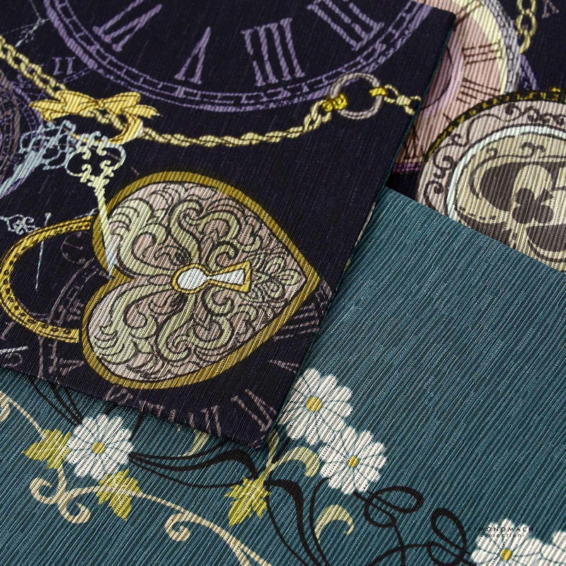 B.時の扉 ブラック:黒地に浅い青紫の線、淡いパープル、黄色、淡いブルーの配色で手描き調の懐中時計や鍵が表現されています。裏面はくすんだ青緑色の地に白い小花の唐草文様。