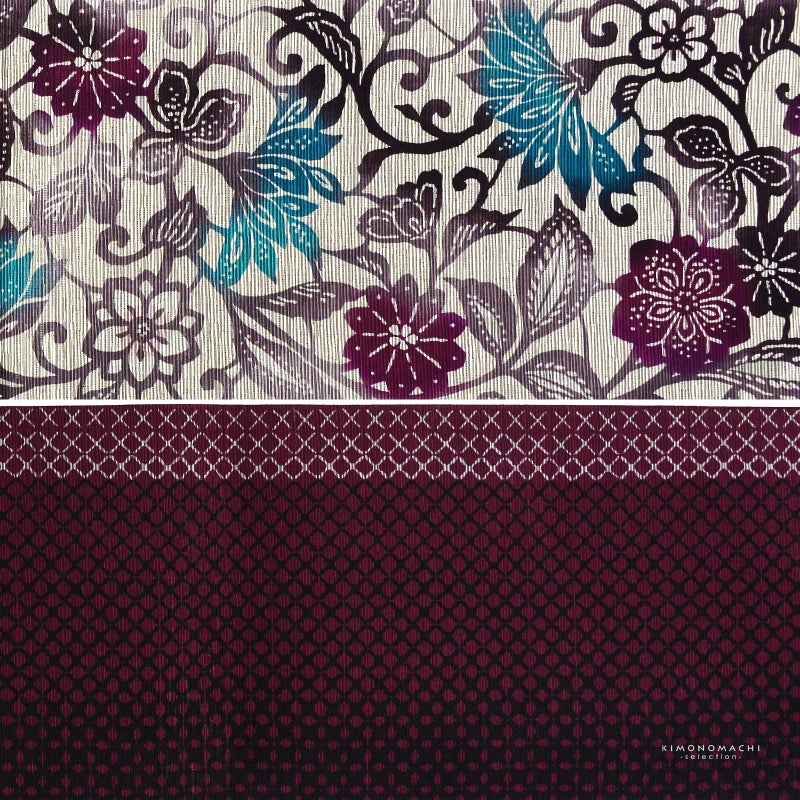 B.和花更紗 紫:グレイッシュな象牙色の地。黒と藤鼠色のぼかしを基調に紫、ターコイズブルー、淡いピンクの挿し色が入った型染め調の唐草に花文様。裏面は葡萄色に黒と白の細かな格子。