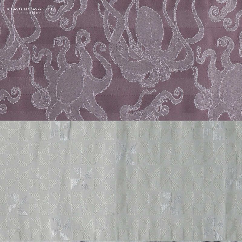 A.灰紫色 縞に蛸尽くし:灰みの鈍い赤紫色。織りで表現された太縞の上に、浅い藤鼠色とシルバーでさまざまな形の蛸が表現されています。裏は浅い白緑色の風車文様。