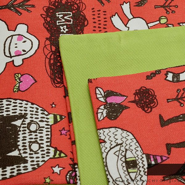 【カラー】赤みの赤ピンク地に、男の子、犬、猿などの桃太郎を連想できるようなポップな模様。裏は濃い黄緑色の無地。