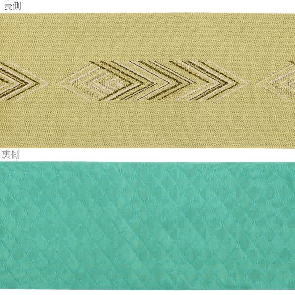 【カラー】薄い黄色の色合い、幾何学縞模様。裏は青みのグリーンの色合いの斜め格子模様。