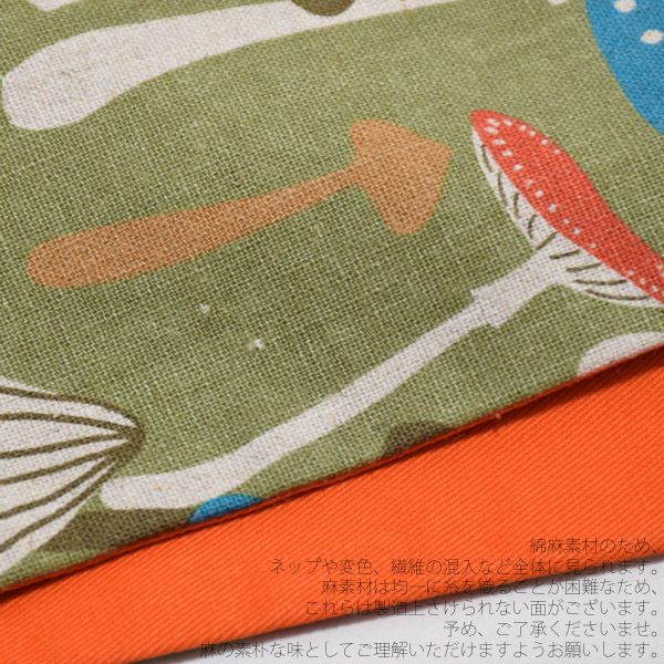 【カラー】少しくすんだ浅いめのグリーン地にブルー、オレンジレッド、ベージュなどの色使いのキノコ模様。裏地は鮮やかなオレンジ色の無地。