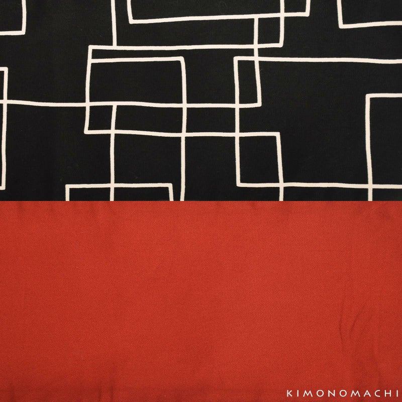 【色柄】黒地に、白に近い生成り色のラインのランダムなスクエア柄。手描き風のゆらぎのある線がシャープになりすぎない味わいを添えています。裏地は深い赤。結び方を工夫して、裏地を見せて締めればコントラストの効いたオシャレな印象に!気軽に楽しんでいただける帯です。