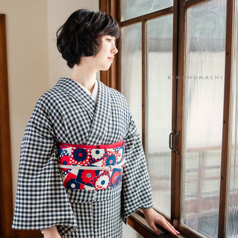 【Prices down2】木綿名古屋帯「ネイビー×レッド レトロフラワー」長尺もあります コットン名古屋帯 仕立て上がり帯 カジュアル 洒落帯 【メール便不可】ss2512ong25