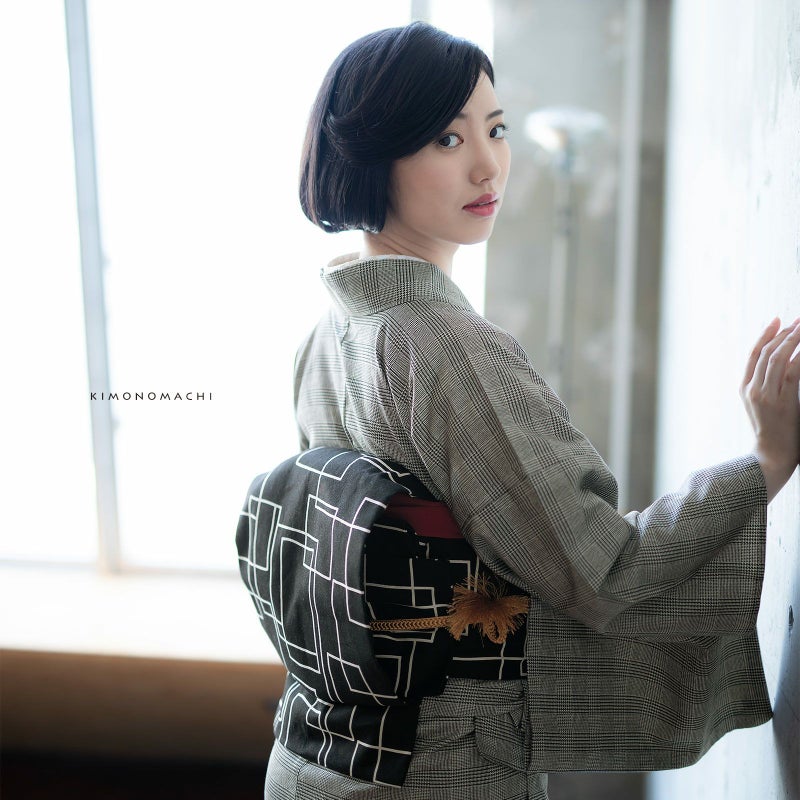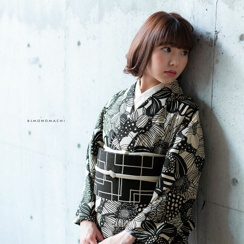 【色柄】黒地に、白に近い生成り色のラインのランダムなスクエア柄。手描き風のゆらぎのある線がシャープになりすぎない味わいを添えています。綿ですのでしなやかで滑りにくく、お太鼓以外の変わり結びにも◎気軽に楽しんでいただける帯です。