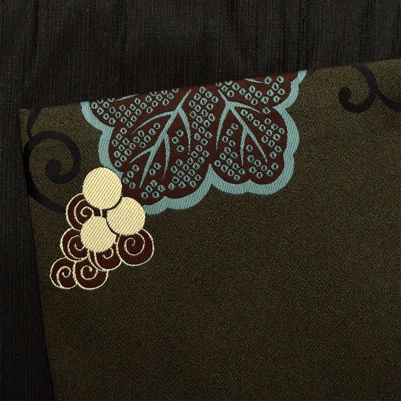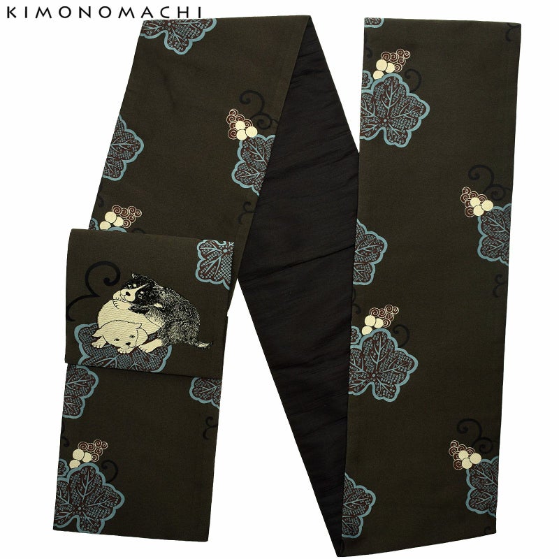 深いモスグリーンの地に、スモークブルー、茶色の葡萄蔦。お太鼓部分には、身を寄せ合うアイボリーと黒の小犬が!黒い小犬のペンタッチのような毛並みの表現や、無邪気な愛嬌たっぷりの表情が他にはないデザインです。合わせやすい落ち着いた色合いと、どことなくユーモラスな雰囲気が魅力の帯です。