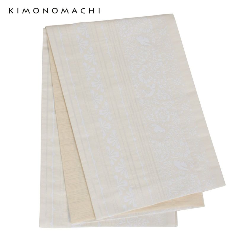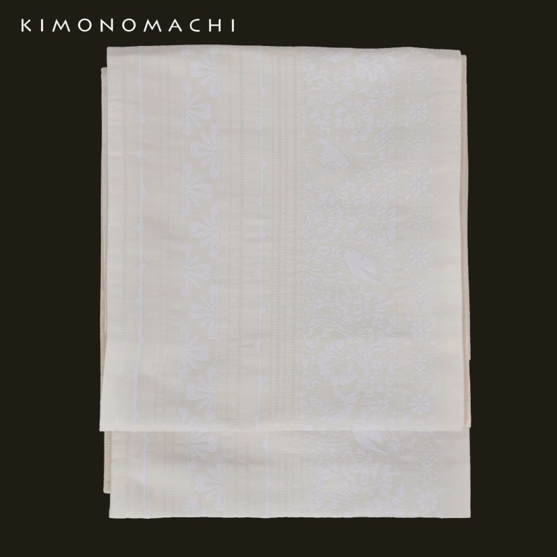 【色柄】アイボリーの地に、白の献上柄風の文様。縦縞に配置された柄は、約半分は花唐草の中を小鳥が飛び交う更紗柄、もう半分は交互に花角紋をのぞかせた縞や三角繋ぎ、合間に織りで表現された子持ち縞などシンプルなデザイン。裏地はエクルベージュ。合わせやすく、古典的な華麗さとすっきりとモダンな印象のある帯です。