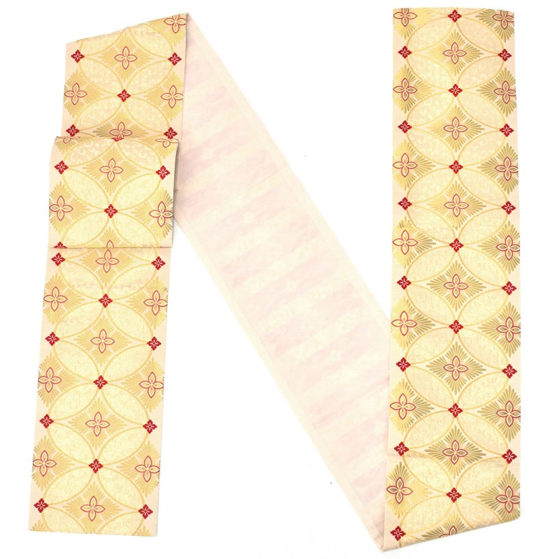 金通しの淡い生成り色の地に、イエローゴールドの花七宝文様。七宝の中心に菊の花弁をあしらった花菱紋。ゴールドを基調とした大胆な七宝文様に、花菱の赤がアクセント。合わせやすく、若々しく華やかな印象にしてくれる帯です。