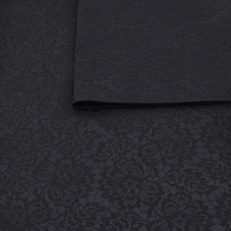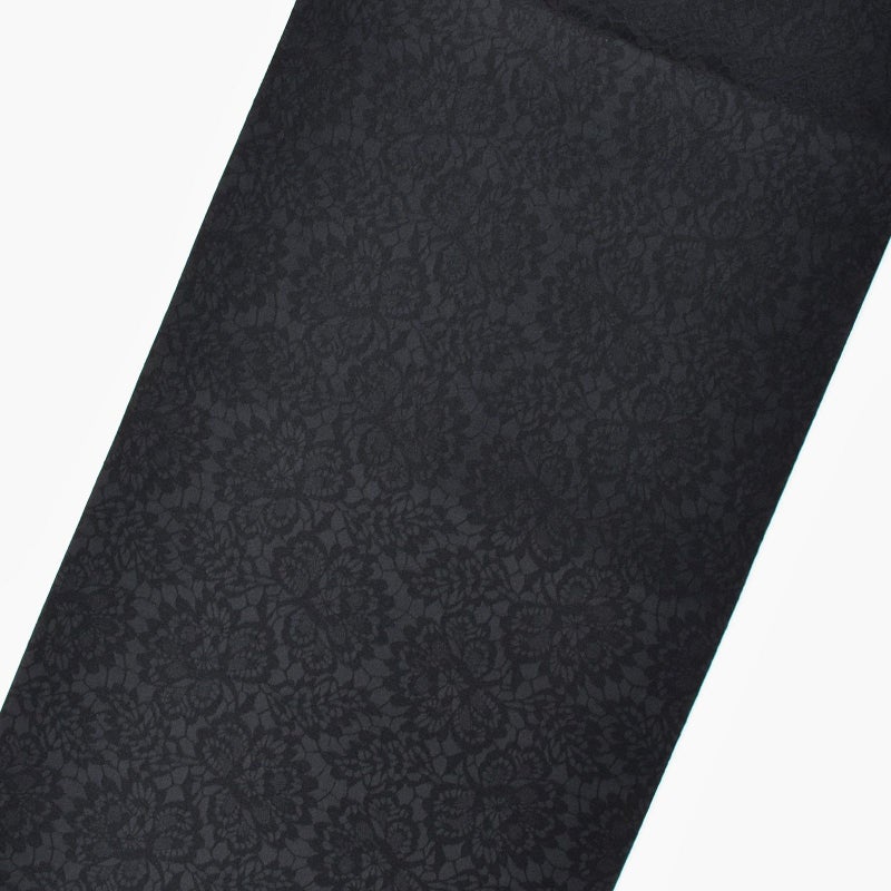 艶のある黒。レース調の花模様が織りで表現されています。黒一色が格好よく、光によって浮かび上がるレース模様は格調高く妖艶な雰囲気を演出します。