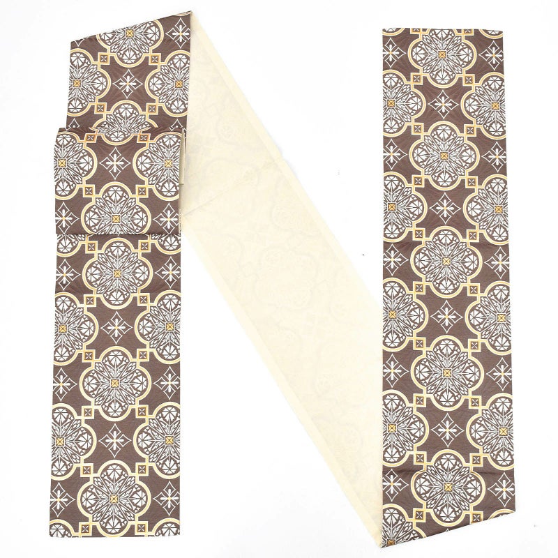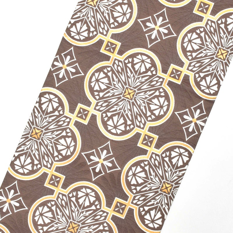 やや浅い茶色の地にゴールド、白のアールデコ調の幾何学模様。ゴールドの四つ葉に四角を繋いだ模様の中に、白の華紋が配されています。モダンにも古典にも装っていただける個性的な帯です。