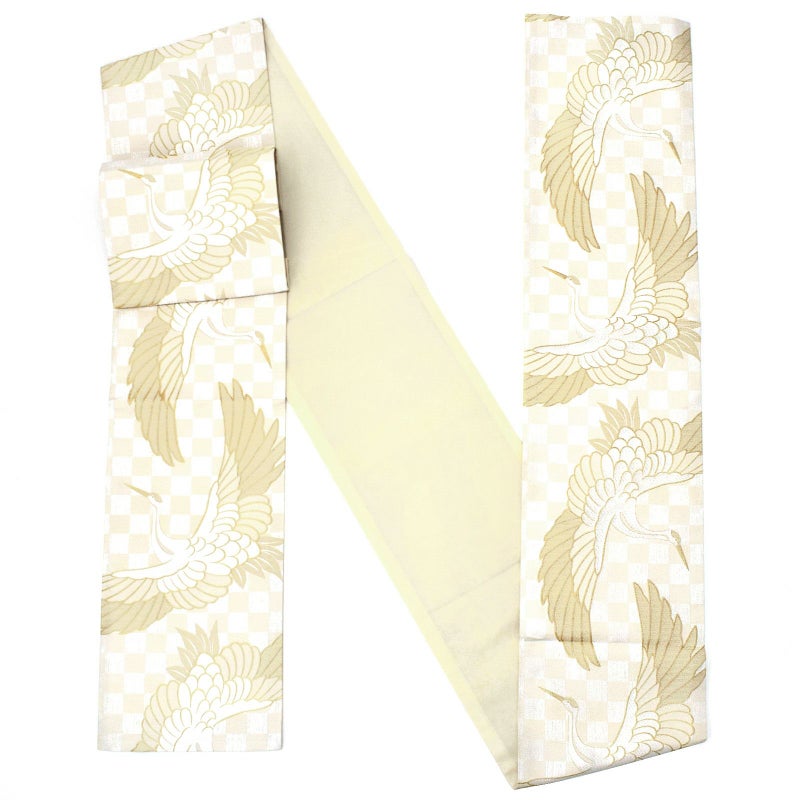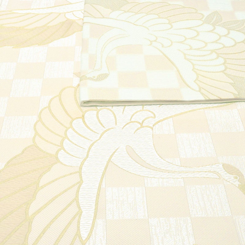 アイボリーとオフホワイトの市松模様の地。控えめなゴールドベージュの輪郭線、白や淡いベージュの羽根の飛鶴が大きく表現されています。古典的なモチーフと現代的な色使いが魅力の帯です。
